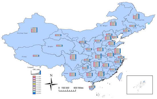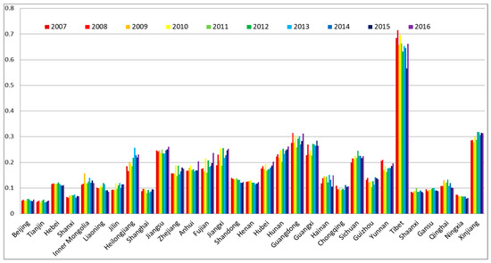 According to Figure 2, during the selected years from 2007 to 2016, the development level of the water subsystem in each province and municipality barely changed. In a spatial view, the development levels of the water subsystem in Beijing, Tianjin, Shanxi, and Ningxia were low; while in Tibet, Xinjiang, Guangdong, Guangxi, Jiangsu, Hunan, Yunnan, Sichuan, Jiangxi, and Heilongjiang, they were relatively high. We found that the total water supply () and the total water capital () were the key factors that affected the development level of the water subsystem by comparing the index contribution . In the regions where the development levels of the water subsystem were high, such as Xinjiang, Guangdong, and Guangxi, the total water supply and the total water capital were relatively high. Especially, Tibet was not only endowed with high total water capital but also with high average per capita water availability [82].