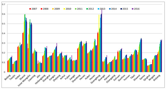 In this study, the development levels of water, energy, food subsystems were calculated first. These results showed the development levels of the three resource subsystems in 31 provinces and municipalities of China in the period from 2007 to 2016 (see Figure 2, Figure 3 and Figure 4).