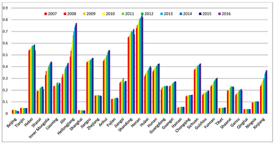 According to Figure 4, there was a large gap between the low and high regions. The development levels of the food subsystem in Beijing, Tianjin, Shanghai, Hainan, Tibet, and Qinghai were the lowest, while the development levels in Hebei, Heilongjiang, Shandong, and Henan were high. The regions with a low development level of the food subsystem kept a steady level from 2007 to 2016. However, the regions with a high development level of the food subsystem showed an increasing trend in this period. The irrigable area of arable land () and the total food output ( were the key factors that affected the development level of the food subsystem, which was clearly shown by comparing the index contribution .
