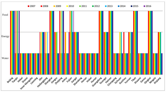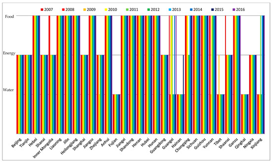 Figure 5 shows the subsystem with the lowest development level, among water, energy, and food subsystems, in all selected regions in the period from 2007 to 2016. The development level of the water subsystem was low in most regions. This proved that China is a country facing a serious water crisis. According to statistics, the per capita water resources in China are only 28% of the world average [76]. Water is the main input of energy and food production; therefore, water shortage has become one of the main factors that restricts the development of most regions in China. So, the water subsystem is key in promoting sustainable development of the core WEF nexus.