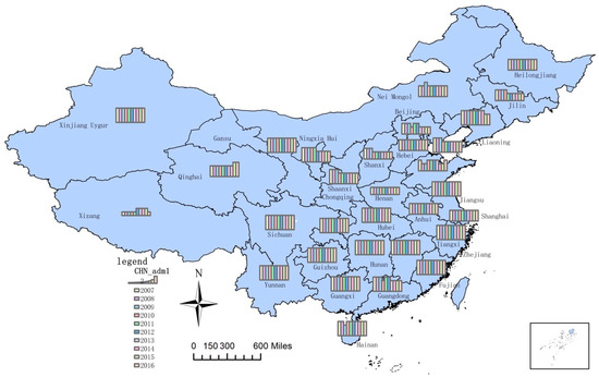 Statistical data from 31 provinces and municipalities were collected from statistical yearbooks as well as the water resources bulletin, which is from official websites of the Statistics Bureau of Provinces and municipalities from 2007 to 2016 [50,51,52,53,54,55,56,57,58,59,60,61,62,63,64,65,66,67,68,69,70,71,72,73,74,75,76,77,78,79,80,81].