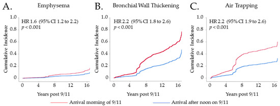 Cumulative incidence of chest CT diagnosis according to WTC exposure intensity. (A) shows the cumulative incidence of emphysema in participants who arrived morning of 9/11 at the WTC site (red line) compared with those who arrived between the afternoon of 9/11 and 24/9/2001 (blue line). (B) shows the cumulative incidence of bronchial wall thickening in those who arrived morning of 9/11 (red) and those who arrived later (blue). (C) shows the cumulative incidence of air trapping in participants who arrived morning of 9/11 (red) and those who arrived later (blue).