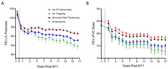 A different pattern emerged when examining longitudinal FEV1/FVC ratio (Figure 4B). When compared with individuals with no airway abnormalities on CT, isolated air trapping was associated with increased FEV1/FVC ratio both before and after 9/11. FEV1/ FVC ratio was lowest in the isolated emphysema subgroup, and intermediate in those with isolated bronchial wall thickening.