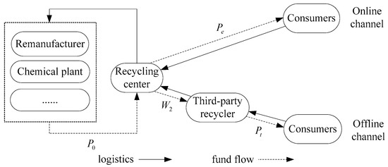 Over the recent decade, the continuous innovation of electronic technology and consumers’ fanatical pursuit of a new generation of electronic products have not only accelerated the speed of electronic product replacement, but also led to the continuous growth of the number of obsolete and abandoned electronic products [1]. In the four years from 2014 to 2018 alone, the number of waste electrical and electronic equipment (WEEE) in the world increased from 41.8 million tons to 50 million tons, and a “garbage-besieged city” became a trend of globalization [2]. Under such a grim reality, China’s recycling enterprises, while retaining the traditional offline recycling channels with low recycling volume, logistics efficiency, and recycling conversion rates, combine internet technology with garbage recycling and actively develop online recycling channels where websites and mobile phone applications directly contact and trade with consumers. For example, GEM, one of China’s largest recycling centers, has vigorously developed online recycling channels through cooperation with the online platform Loving Recycling on the basis of retaining traditional offline recycling channels. This kind of dual-channel reverse supply chain (DRSC), which coexists between online and offline recycling, has been widely focused on by the recycling industry and academia. However, there are many differences between online and offline recycling channels in DRSC. For example, online channels usually charge higher prices for consumers than offline channels. In addition, online channels use apps to communicate with consumers and express delivery personnel to pick up items at any time, so its convenience has also become the reason why consumers choose it, which have also made offline recyclers feel threatened. Therefore, around the differences and conflicts between different channels in DRSC and other factors, scholars have studied them from the perspectives of pricing decisions, recycling processes, revenue models, contract coordination, and other aspects [3]. Among them, the recovery pricing problem will not only affect the upstream and downstream relationship of the supply chain, consumers’ recovery willingness, and recovery amount, but will also affect the unit operation and maintenance profit of recovery enterprises [4]. Therefore, it is of great significance to set a reasonable recovery price to promote consumers’ recovery amounts, reduce the conflicts between supply chain channels, and enhance the competitiveness of recovery enterprises.