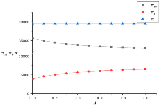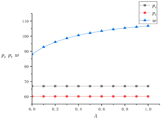 In addition, although λ is constantly changing, the total profits of the supply chain system remain unchanged in homeostasis. This is because although the TPR’s fairness concerns have affected its formulation of the transfer price w with the recycling center, the TPR’s bargaining power does not involve the online recycling price of the recycling center, so the formulation of pe keeps unchanging with λ and is not affected by it. The same reason can also explain that the TPR has not changed the offline recovery price pt for consumers. Therefore, for the whole supply chain system composed of the recycling center and TPR, its income and expenditure have not changed, which leads to the total revenue of the whole supply chain system not being changed, too.