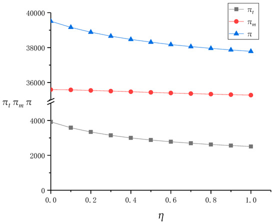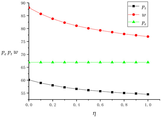 In this subsection, we analyze the model results in Section 3.3. In the context of the Section 3.3 model, on the one hand, the TPR does not have fairness concerns. On the other hand, although the recovery efficiency and conversion rate of traditional offline recovery channels are low, the market share is still high due to its long existence in the market, which adds difficulties and obstacles to the introduction of online recovery channels based on the Internet for the recycling center. Therefore, the recycling center believes that the profit distribution in a DRSC is unfair, and there is a fairness concern coefficient η that gradually increases from 0 to 1. Based on this, similar to the simulation in Section 4.1, we used Mathematica software to obtain the income values of pt, w, pe, and the entire supply chain system, as shown in Table 3, and their line charts are affected by η, as shown in Figure 4 and Figure 5.