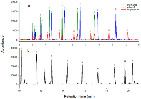 Gas chromatography-micro-electron capture detector (GC-μECD) chromatograms of (a) PFCAs esters produced by using three different alcohols; (b) PFCAs anilides derivatized by using 2,4-DFA and DCC. Peak identification: (1) PFBA, (2) PFPeA, (3) PFHxA, (4) PFHpA, (5) PFOA, (6) PFNA, (7) PFDA, (8) PFUnA and (9) PFDoA.