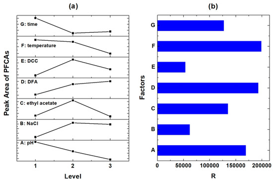 Results of the orthogonal design experiments: (a) the trends of PFCAs anilides peak area along with the varied levels of the factors; (b) comparison of the extremum differences (R) between the factors.