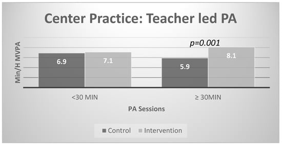 Figure 1 presents the results of the stratified analysis for center practice. There were significant intervention effects for centers with high but not low baseline levels of teacher-led physical activity (≥ 30 min). Specifically, post-intervention physical activity was higher in the intervention group compared to the control in centers with more teacher-led PA at baseline (control = 5.9, intervention = 8.1).