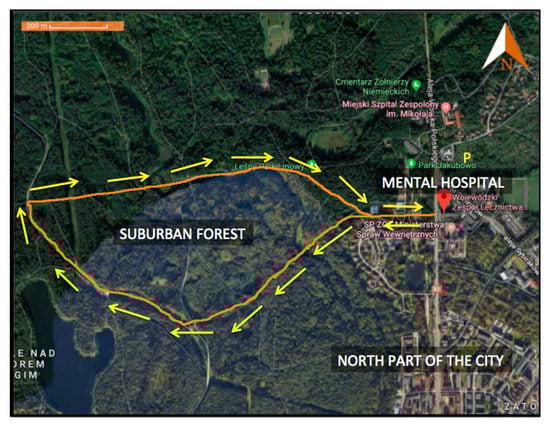 Between August and September of 2018, patients of the mental hospital in Olsztyn participated voluntarily in forest recreation interventions organised by medical staff at the hospital. On 12 different occasions throughout the day (four to five patients per one forest therapy session), patients were encouraged to participate in forest walks with additional exercises in the forest environment (walking, stretching, watching landscapes). This intervention took place under the supervision of a qualified therapist. Patients spent an hour and forty-five minutes in the forest during each forest recreation programme. Patients participated in the therapy once, each time the therapy was organized around noon. The first small group participated in the therapy on July 27th and the last group on November 29th. The number of patients in the hospital ward was small, so they could not communicate and exchange experiences about the experiment at the time (patients who participated in the study stayed in the hospital for a short time, hence they could not contact new patients and tell them about the therapy). The walking route for forest recreation is shown in Figure 1. Before and after interventions, psychological questionnaires were administrated to patients, allowing them to assess their perceived feelings before and after the forest therapy. The questionnaires before and after interventions were filled out in an indoor environment, in conference rooms in the hospital.
