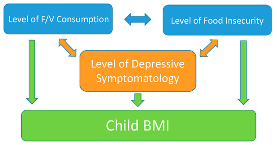 Similarly, maternal depression and household FI may have a bidirectional relationship and may be intertwined as a dynamic process over time. In fact, researchers found that FI predicts increases in depression in women better than income or education [42]. Conversely, women experiencing depression are more likely to be food insecure [43]. Longitudinal research is needed to address the interrelationship between all three variables more clearly—maternal depression, household FI, and child FVC—with additional measures of key constructs, replicating findings in other samples, and tracking changes over time with and without targeted interventions.