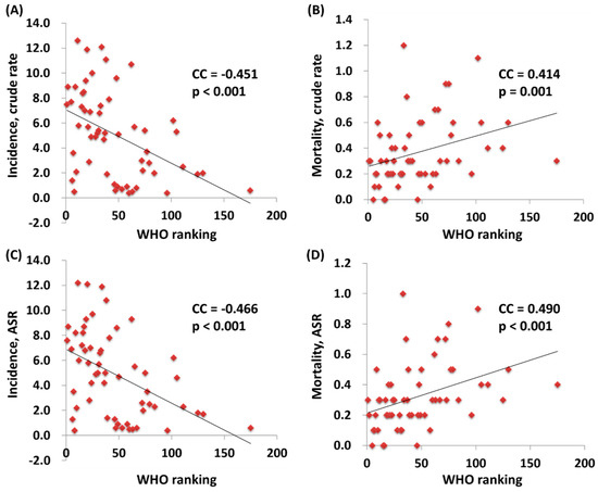 The association between the World Health Organization’s rankings and crude rates of (A) incidence and (B) mortality, and the ASR (age-standardized rate) of (C) incidence and (D) mortality.