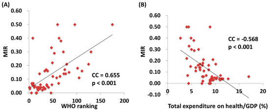 The World Health Organization’s (A) rankings and (B) total expenditures on health/GDP are significantly associated with the MIR in testicular cancer.