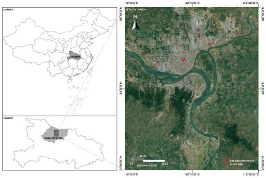 Xiangyang is a prefecture-level city lying on the middle reaches of the Han River in central China (Figure 1), and features a subtropical monsoon climate all the year round. According to the Xiangyang Statistical Yearbook 2018, half of the Gross Domestic Product (GDP) of Xiangyang is derived from industrial production, especially from automobile manufacturers and chemical industries [26]. Consequently, severe haze episodes have been observed more frequently here. To clarify the agglomeration and diffusion mechanism of air pollution, an hourly monitoring network of air pollutants and meteorological parameters was established in the built environment of Xiangyang by the Xiangyang Environmental Monitoring Center in February 2018.