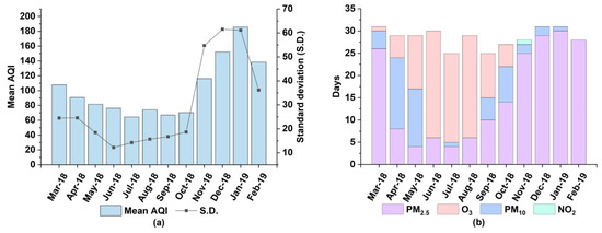 Characteristics of the air quality index (AQI) and the primary pollutants to AQI in Xiangyang by months from March 1, 2018 to February 28, 2019: (a) AQI; (b) primary pollutants.