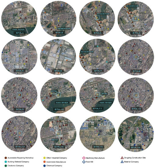 Locations of the industrial facilities were obtained from the Xiangyang Natural Resources and Planning Bureau (XNRPB) [36] and Google Maps (the Google LLC, Mountain View, CA, US). The list of on-going construction sites was collected from the website of Xiangyang Housing and Urban-Rural Development Bureau [37]. Then, we pinpointed them on the Google Map. Moreover, 16 buffer zones of measurement stations were created, and the optimal radius of the buffer zone was demonstrated to be 1 km by prior studies [38,39].