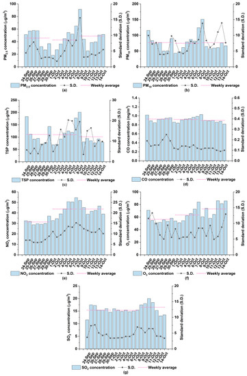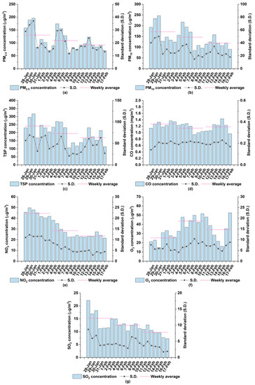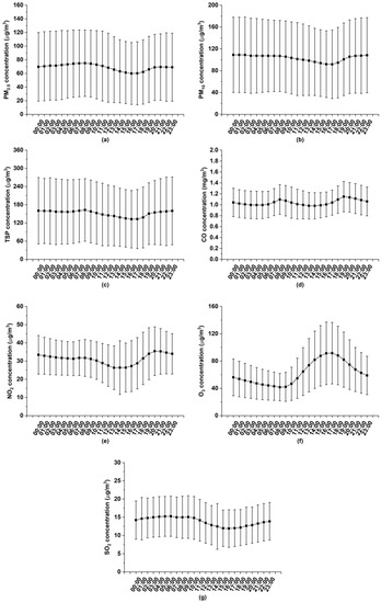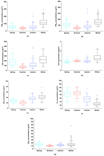 Seasonal variations of air pollutants in Xiangyang from March 1, 2018 to February 28, 2019: (a) PM2.5; (b) PM10; (c) total suspended particles (TSP); (d) CO; (e) NO2; (f) O3; (g) SO2.