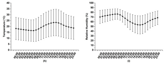 Daily variations of mean values of air pollutants, temperature and relative humidity in Xiangyang from March 1, 2018 to February 28, 2019: (a) PM2.5; (b) PM10; (c) TSP; (d) CO; (e) NO2; (f) O3; (g) SO2; (h) temperature; (i) relative humidity (The bars indicate mean value ± standard deviation).