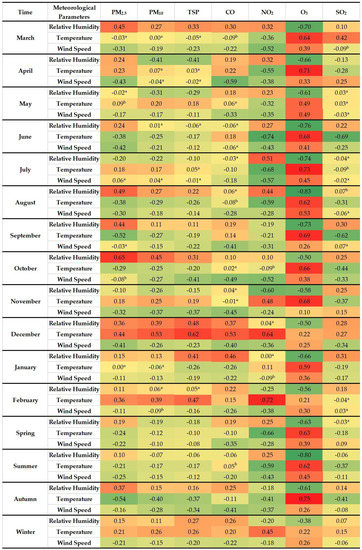 3.4. Relationships between Air Pollutants and Meteorological Parameters