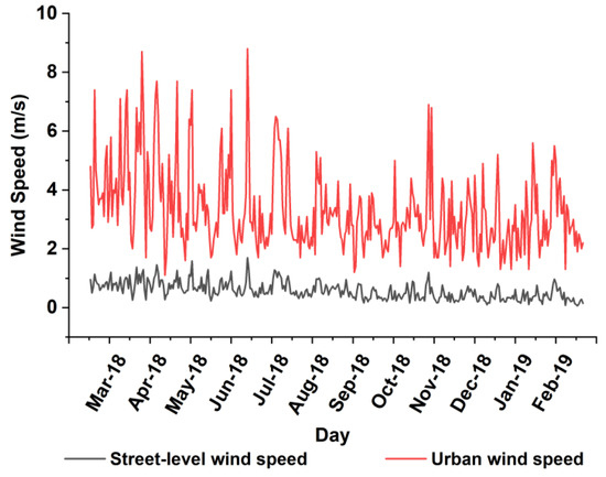 Comparisons of monthly mean variations for street-level wind speed (collected by 16 measurement station) and urban wind speed (collected by the China Meteorology Administration) from 1 March 2018 to 28 February 2019.