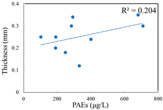 The total concentrations of PAEs in commercial bottled water stored in PET bottles at 40, 50, 60 and 70 °C were 0.31 ± 0.09, 0.31 ± 0.09, 0.36 ± 0.07 and 0.34 ± 0.10 μg/L, respectively (Figure 3). Moreover, there was a weak negative correlation between the bottle thickness and the amount of PAEs in commercial water (Figure 4). However, the PAE concentrations remained unchanged with the increase of temperature, and the PAE concentrations were independent of water types. No significant difference was observed among compounds in water stored in PET bottles from the 10 brands, except for brand B and H, which also showed a weak increasing trend (p > 0.05). Similarly, the concentrations of DBP, DMP and DEP accounted for more than 60% of total PAEs in all samples, of which the DBP was the most abundant compound, and the concentration of DEHP was also lower than the available standards of WHO (8 μg/L), China (8 μg/L), and USEPA (6 μg/L) [12,13,14].