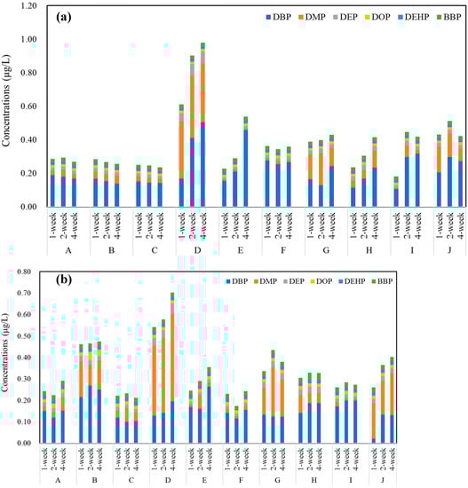 All six kinds of PAEs were detected in the 10 different brands of commercial bottled water stored under outdoor conditions (Figure 2a). The total concentration of PAEs ranged from 0.19 to 0.98 μg/L with an average value of 0.39 μg/L. Similarly, the concentrations of PAEs in PET bottled water stored under indoor conditions ranged from 0.18 to 0.71 μg/L, with an average value of 0.34 μg/L (Figure 2b). Among the 10 brands, the highest concentrations of PAEs were detected in brand D, no matter if they were stored outdoors or indoors. No significant differences were observed between concentrations of PAEs in water stored indoors or outdoors (p > 0.05). However, the total concentration of PAEs in brands D and E showed a weak increasing trend, which was mainly attributed to the increase of DBP concentration. Among these compounds, DBP and DMP were the most common and abundant PAEs, accounting for more than 60% of total PAEs measured in all samples. Compared with the available data, the concentration of DEHP was lower than WHO standards of 8 μg/L [12], China standards of 8 μg/L [13] and US EPA standards of 6 μg/L [14].