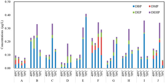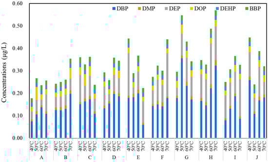Three kinds of PAEs were detected in pure water samples, including DBP (0.011 μg/L), DEP (0.001 μg/L) and DOP (0.005 μg/L), implying that contamination by PAEs was common in the present environment besides lab conditions. Moreover, four kinds of PAEs were detected in pure water samples collected from PET bottles (Figure 5), whereas six PAEs were detected from commercial water collected from PET bottles, which were different from those detected in the pure water. Namely, DMP (0.02–0.13 μg/L) was only detected in renewed pure water from the brands A, F and J bottles, whereas three compounds were detected in all other brands, ranging from 0.005 to 0.08 μg/L for DEP, from 0.01 to 0.38 μg/L for DBP, and from 0.01 to 0.09 μg/L for DEHP, which were also lower than the standards of WHO (8 μg/L), China (8 μg/L) and USEPA (6 μg/L) [12,13,14]. The total concentration of PAEs ranged from 0.04 to 0.41 μg/L, and no positive relationship was found between the PAEs concentrations and storage temperature. However, the PAE concentration was slightly increased in brand E and G with the increase of temperature (p > 0.05), and this increase could be mainly attributed to DBP. This finding was also similar to the result of brand B and H bottles containing commercial water.