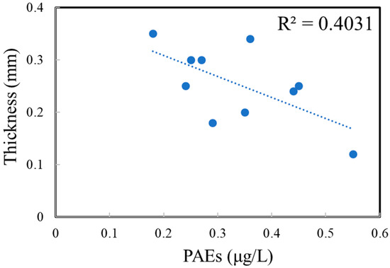 Correlations between the bottle thickness and amount of phthalate esters (PAEs) in polyethylene terephthalate (PET) bottles.