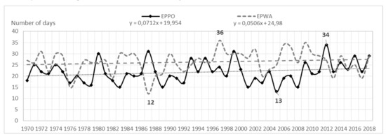 Average annual number of storm days and a linear trend in EPPO and EPWA (1970–2018).