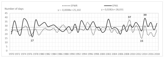 Average annual number of storm days and a linear trend in EPWR and EPKK (1970–2018).