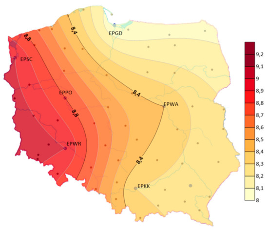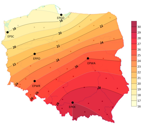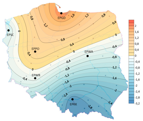 The analysis showed that the air temperature influences the formation of storms. Therefore, the article also presents an analysis of changes in air temperature. The analysis included data from the Polish Institute of Meteorology and Water Management from the period 1970–2018 for the airports: EPGD, EPSC, EPPO, EPWA, EPWR, EPKK. It was examined that the average annual air temperature in the years 1970–2018 ranged from 8.0 °C at EPGD airport to 9.1 °C at EPWR airport (see Figure 8).