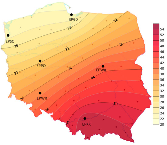 There were big differences in the geographical distribution—storms were less frequent in the northern part of the studied area and in the Baltic coast area than in southern Poland. The average annual number of days with a storm ranged from 17 in EPGD to 29 in EPKK (see Figure 4). The maximum average annual number of days with a storm ranged from 28 in EPGD to 39 in EPKK.