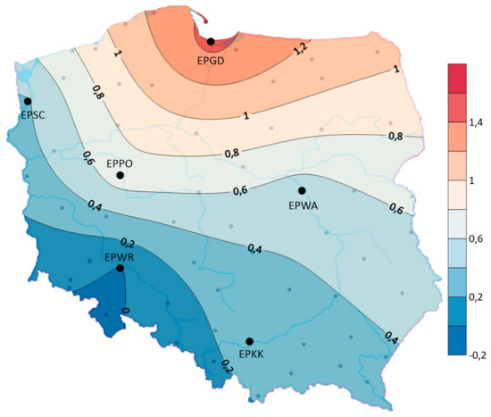 The assessment of storm frequency variability in time was based on a linear regression analysis that determines the increase or decrease in storm frequency per unit of time. The analysis of the linear trend coefficients showed that in the years 1970–2018, in the studied area of Poland, the linear trend was positive (except for a slight decrease in EPWR) for the average annual number of days with a storm. The spatial distribution shows that the average annual number of days with a storm showed the largest upward trend of 1.5 days/10 years in the north—especially at EPGD. In contrast, the frequency of storms did not change at EPWR airport. At the EPGD and EPPO airports, the trend of increasing the frequency of storms meant that the average duration of storms in the year increased (see Figure 6). At other airports, despite the tendency to increase the frequency of storms, there was a tendency to decrease their duration. The largest decrease was observed in EPKK—3 h/10 years (see Figure 7). In addition, it was observed that at all airports individual storms tend to be shorter.