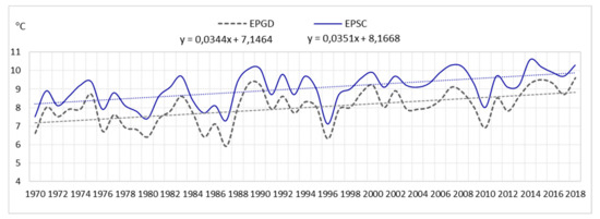 Average annual air temperature and linear trend in EPGD and EPSC (1970–2018).
