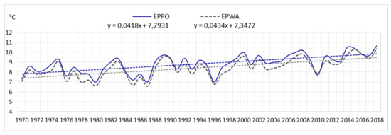 Average annual air temperature and linear trend in EPPO and EPWA (1970–2018).