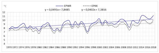 Average annual air temperature and linear trend in EPWR and EPKK (1970–2018).