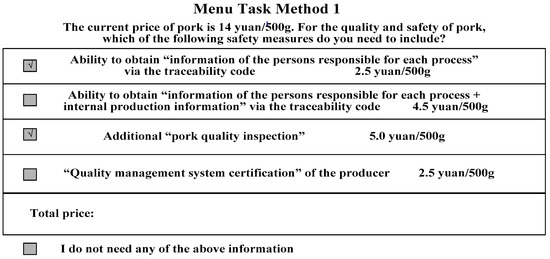 Since traceable pork is not popular in China, and the types of traceable pork with different functional attributes discussed in this study belong to virtual traceable pork profiles (which do not yet exist in the current Chinese market), it is difficult to obtain a large amount of actual purchase data. Therefore, it is suitable to study consumers’ stated preferences for traceable foods. The purpose of this paper is to explore the interactions between multiple attributes and consumers’ responses when the cost-driven price changes. The menu-based choice (MBC) experiment method, one of the preferred research methods, is an appropriate tool to capture the corresponding reactions of consumers when the price changes [24]. The menu-based choice experiment method allows consumers to choose product attributes independently and more accurately simulates consumer product purchase situations in the real market based on mass customization [25]. It also measures consumer price sensitivity. Moreover, menu-based experiments generate more virtual product profiles than those of choice experiments or conjoint analyses, thereby helping solve the problem of the substitution effect between attributes [21] and response errors in multitasking [22], which are common in general choice experiments. Therefore, this study used a menu-based choice experiment method to carry out specific research.
