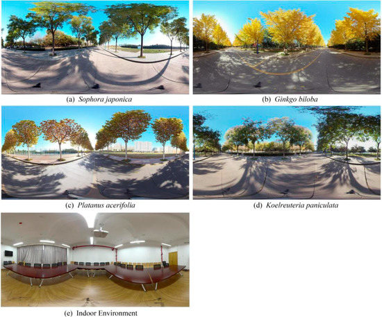 Figure 1. The panorama of experimental scenes in the VR model. (a) Sophora japonica, (b) Ginkgo biloba, (c) Platanus acerifolia, (d) Koelreuteria paniculata, (e) Indoor environment.