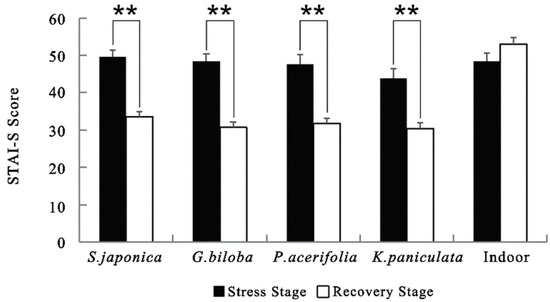 Paired t-tests showed that the STAI-S scores significantly decreased after viewing street trees (for all p < 0.01; Figure 5). No significant difference was found in levels of anxiety relief in the indoor environment. The STAI-S scores after viewing street trees G. biloba (17.72 ± 2.02) decreased the most, followed by S. japonica (15.97 ± 2.05), P. acerifolia (15.79 ± 2.53) and K. paniculata (13.65 ± 2.29).