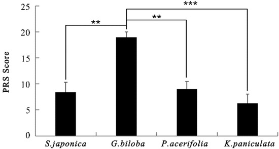 The overall PRS values of four kinds of street trees were positive (Figure 6). One-way analysis of variance showed significant differences in the four scenes (F = 4.76, p < 0.01). A Tukey post-hoc test revealed that street trees G. biloba were rated high in perceived restorativeness, comparing to the other three street trees (for all p < 0.01). The restorative potential was substantially higher in G. biloba (18.960 ± 2.040) than that in S. japonica (8.417 ± 2.915), P. acerifolia (9.000 ± 2.482), and K. paniculata (6.267 ± 2.787).