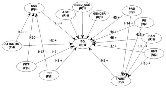 When deconstructing the total effect into direct and indirect effects via the mediators, both TRUST and SCS were statistically significant in explaining EQ, in turn, confirming H8 and H9, respectively. Each of the predictors of these mediators was statistically significant; thus, the hypotheses H10–H16 were accepted.