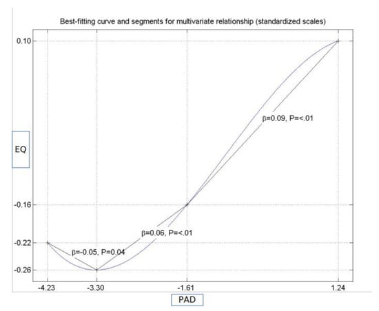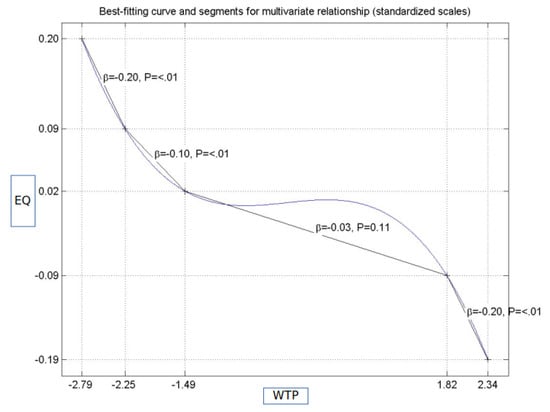 Figure 2 and Figure 3 capture a very important result of our research. While the initial research model assumed linear relationships among variables, we found that two of them were non-linear, including the relationship between PAD and EQ and that between WTP and EQ. Table 5 shows that the relationship between PAD and EQ was positive and statistically significant, in terms of both a direct effect and a total effect. The results imply that, as the score for PAD increased, the score for EQ increased as well, at a constant rate. What Figure 2 shows instead is that the direct relationship between these two variables held only if PAD went above a certain threshold. Moreover, the relationship was barely linear and could be characterized by two different slopes: 0.06 when the score of the perceived doctors’ attitude range was between −3.30 and −1.61 (standardized values), and 0.09 beyond this value. Furthermore, since the curve was convex between −3.30 and −1.61 and concave above −1.61, we expected that the increase in the overall satisfaction was steeper in the first case and slower in the second case.