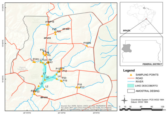Thus, studies that consider the characteristics of each region are necessary for contributing to land use management and avoiding the deterioration of aquatic ecosystems [16]. Evaluation of mercury levels in tropical reservoirs without direct influence from known anthropogenic sources has not been frequently conducted [17], particularly in the Brazilian Cerrado. This study aimed to evaluate the distribution of THg levels in the bottom sediments of the Descoberto reservoir (Federal District, Brazil), built in 1979 to supply potable water to the Federal District, and in tributaries of the Descoberto river watershed, including the Descoberto river environmental protection area (DREPA). This region suffers from the intensification of diffuse pollution, as showed in a geochemical study of the stream sediment of the Descoberto river watershed (DRW) carried out in 2005, in which the concentrations of P, Mn, Ba, Ca, Mg, and K demonstrated the effects of anthropic activity in this region. However, studies in the DREPA on the indispensable comparison between Descoberto Lake and its tributaries regarding mercury accumulation are lacking.