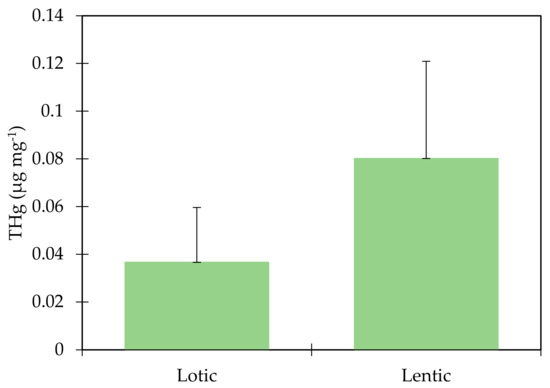 Comparison of THg concentration between the lotic environment and lentic environment U-test (p = 0.002).