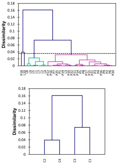 Based on Figure 3 and Table 4, it was noted that the groups formed regarding the THg concentrations correspond to the type of aquatic environment, lentic, and lotic. Group 1 (C1) is basically formed by the sampling sites in the lotic environment, except for the presence of the point L3. This group is composed of two subgroups, where L3, P10, and P22 correspond to sites with no apparent correlation with the terrestrial pathway or drainage receiving water body.