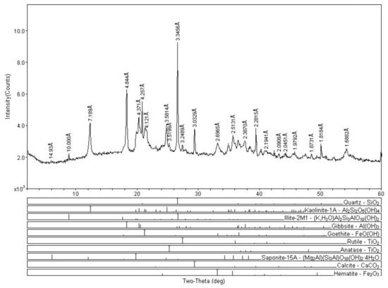 Table 5 shows the mineral constituents of the DREPA sediment samples. Quartz appears as the main constituent in all samples, followed by kaolinite, illite, and gibbsite, as minor constituents. Although not in all samples, rutile, goethite, anatase, saponite, calcite, dolomite, and hematite also appear.