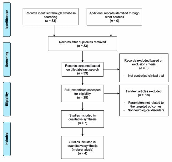 Firstly, a total of 83 articles were obtained. Once the duplicates were removed, 33 articles were obtained. After the selection process, a total of seven studies were included in the review, of which four were included in the meta-analysis for the statistical comparison. The entire selection process in the corresponding phases is detailed in Figure 1.
