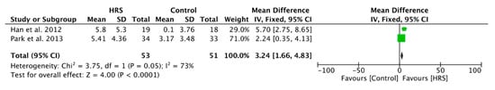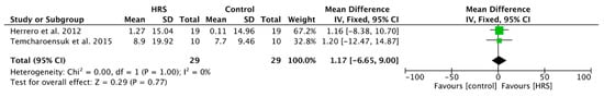 Firstly, analyzing the effects on balance measured employing Berg Balance Scale (BBS), the results showed that HRS caused significant improvements compared with the control group, which received CPT. The study of Han et al. [] was the one that had a major effect on weight. The overall result of the meta-analysis is favorable. Regarding the effects of sitting postural balance measured using Gross Motor Function Measure (GMFM-66) Sitting Dimension, none of the interventions produced a significant improvement. The overall result of this meta-analysis is not conclusive. Figure 2 and Figure 3 show the results obtained after the meta-analysis.