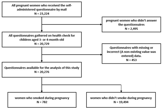 A total of 20,729 women with children aged 3 or 4 months old participated in this evaluation. We requested them to answer self-administered questionnaires sent by mail and gathered them when they came for a health check for their child. Of the 23,224 women who received the questionnaire, 20,729 women responded. Among them, 20,276 with available data were included in the analysis. The participant selection flow chart is shown in Figure 1.