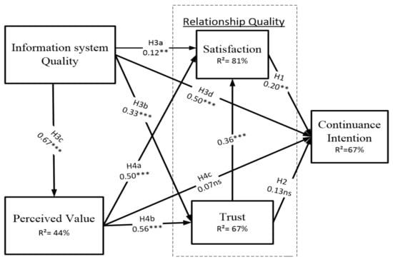 The results of the Smart-PLS part coefficients and significance values are shown in Figure 2. Table 6 shows the summary of our hypotheses testing. Seven of the nine hypotheses have positive and significant relationships. Customer satisfaction has a positive and significant effect on continuance intention, which supports H1, SAT–CI (β = 0.20, t = 2.59, ** p < 0.01). However, the influence of customer trust has no significant relationship with continuance intention. Thus, H2 is not supported, trust–continuance intention (TR–CI) (β = 0.13, t = 1.89, p < 0.05). The testing (H3a, H3b, H3c, and H3d) showed that information system quality has a positive and significant effect on customer satisfaction, trust, perceived value, and customer continuance intention. Thus, H3a, information system quality–satisfaction (ISQ–SAT) (β = 0.12, t = 2.99, *** p < 0.001), H3b, ISQ–TR (β = 0.33, t = 5.82 *** p < 0.001), H3c, ISQ–perceived value (PV) (β = 0.67, t = 17.0 *** p < 0.001), and H3d, ISQ–CI (β = 0.50, t = 7.50, *** p < 0.001) were supported. Consequently, the (H3a, H4b), customer perceived value has a positive and significant effect on customer satisfaction and customer trust. Thus, H4a and H4b were supported (PV–SAT, β = 0.50, t = 8.30, *** p < 0.001, and PV–TR, β = 0.56, t = 10.1, *** p < 0.001). However, perceived value does not have a significant influence on customer continuance intention, and so H4c, PV–CI (β = 0.07, t = 0.97, p < 0.05) is not supported. The model also explains 67% of the variance of customer continuance intention, 81% of the variance of customer satisfaction, 67% of the variance of a customer trust relationship, and 44% of the variance of customer perceived value of the product or service on an e-tourism channel.
